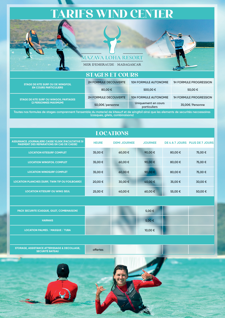 - Location de matériel windsurf et kitesurf (consultez nos tarifs).